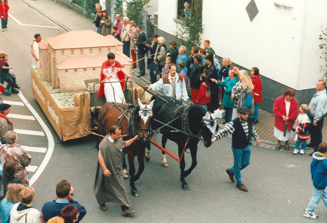 Vor einem der letzten Gemeindefeste hatten sich Johannes Seidler und Heinrich Münch, unterstützt von Heinrich Gilbert, die Aufgabe gestellt, ein Modell dieses römischen Gutshofes zu fertigen. In sechs Wochen täglicher Arbeit, unter Zugrundelegung historischer Ermittlungen und mit viel eigener Phantasie entstand das Modell, das im Gemeindemuseum seinen festen Ausstellungsplatz hat und nun beim Festzug zu sehen sein wird.